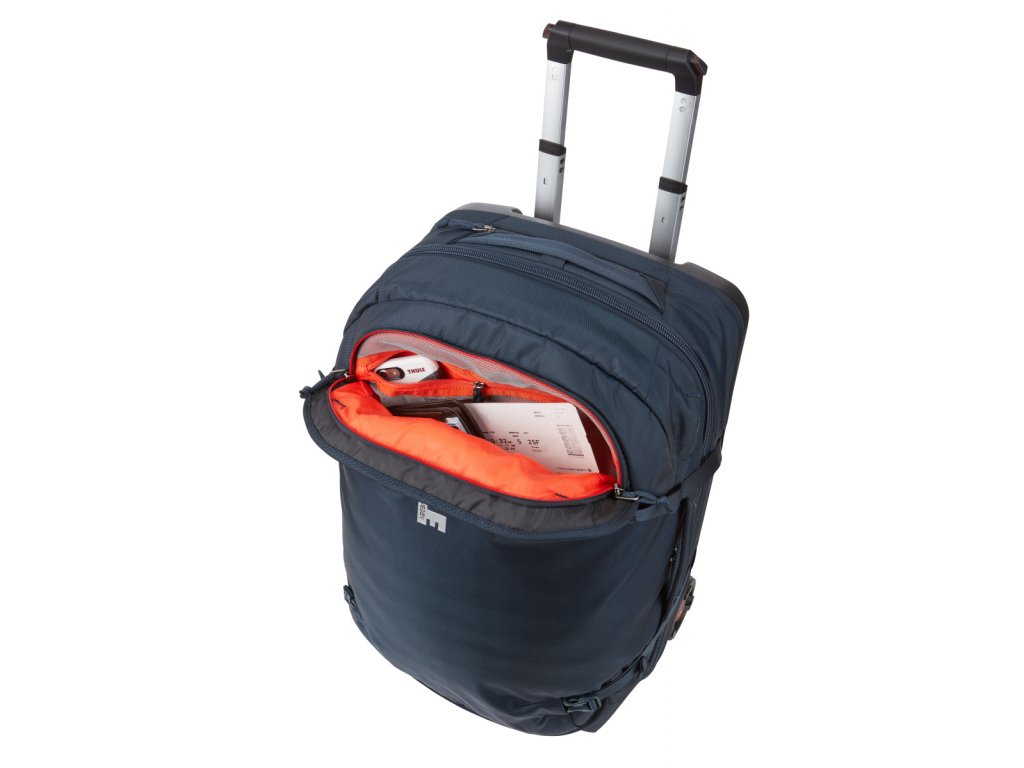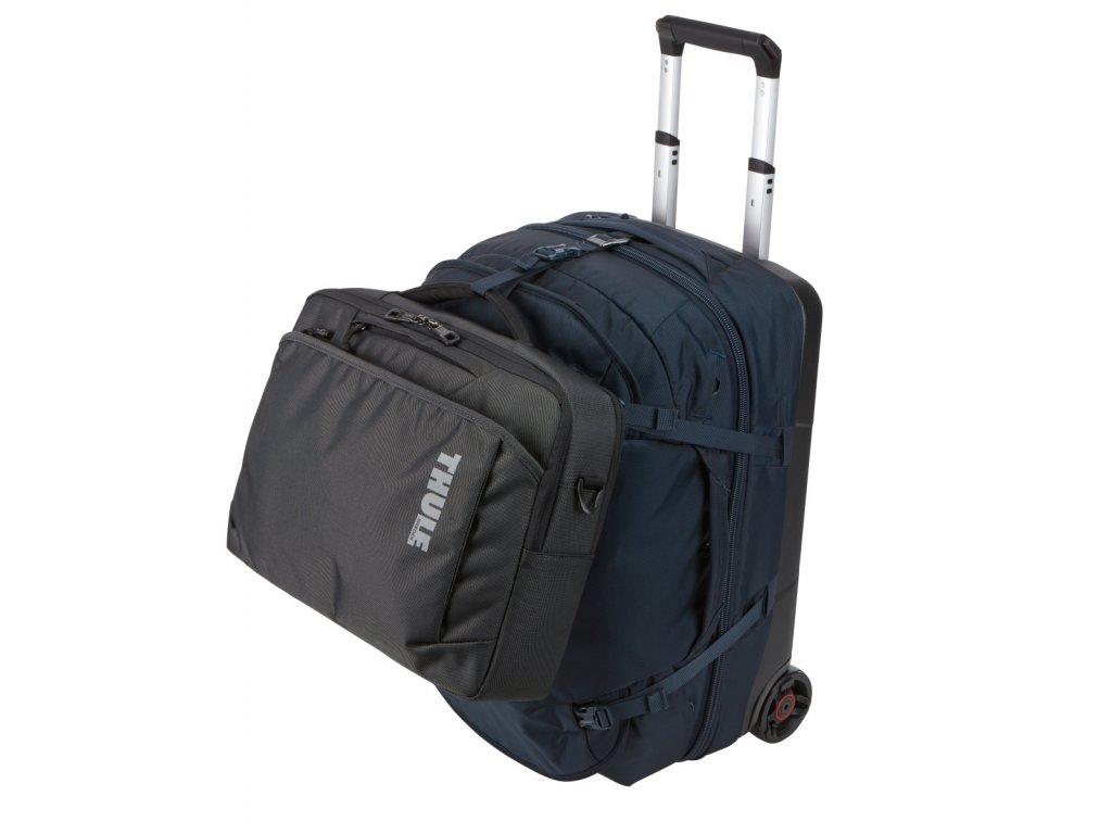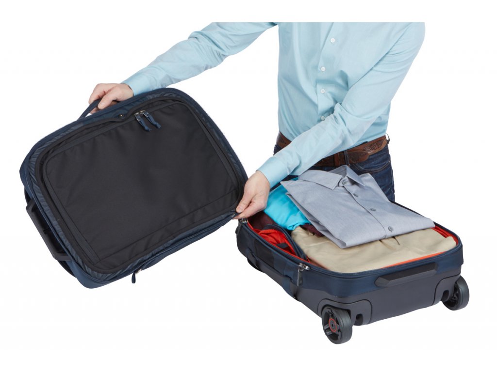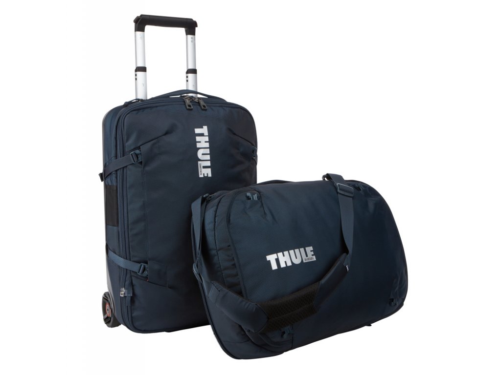 Cestovný kufor 56 l modrosivej farby značky Thule z edície Subterra 3 v 1 možno pohodlne rozdeliť na dva nezávislé kufre spĺňajúce podmienky pre príručnú batožinu čo uľahčí odbavenie.
