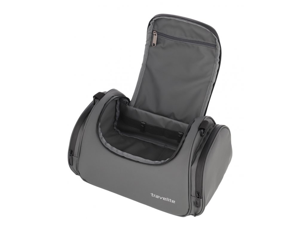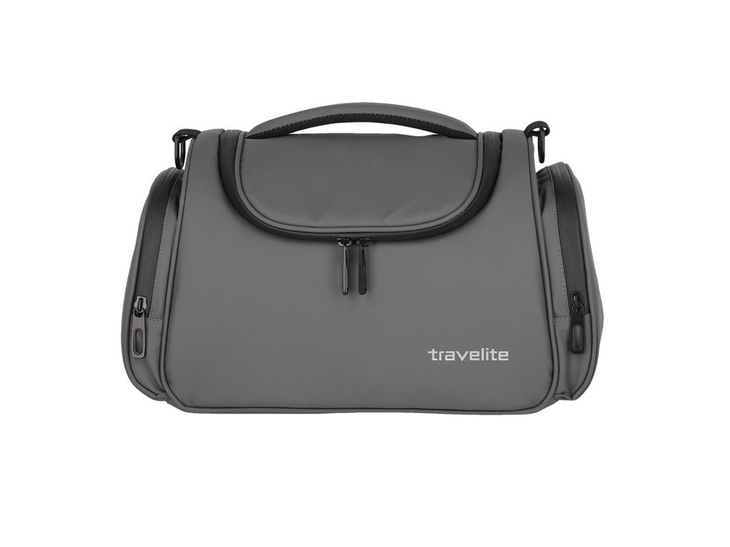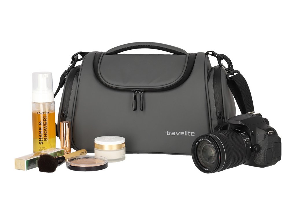 Multifunkčná textilná taška Travelite v šedej farbe. Vhodná ako príručná taška na toaletné potreby, lieky i doklady, ktoré sú na cestách nevyhnutné. Možné použiť aj ako tašku pre fotografické potreby.