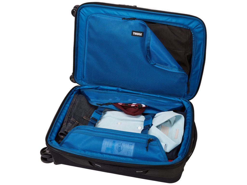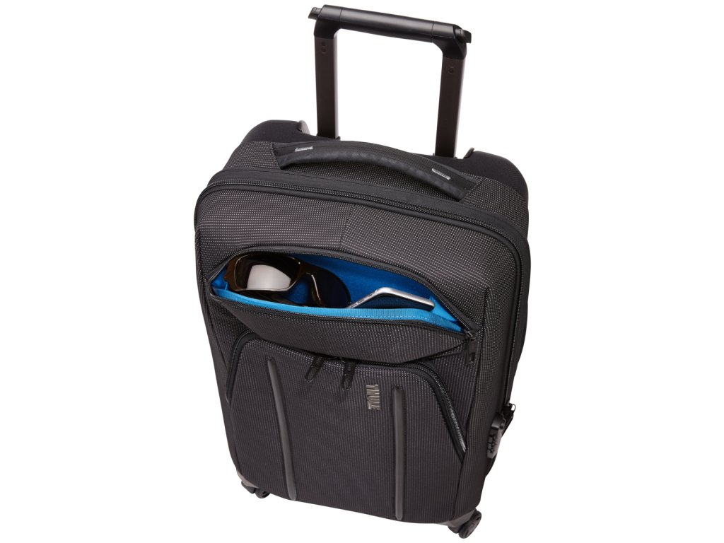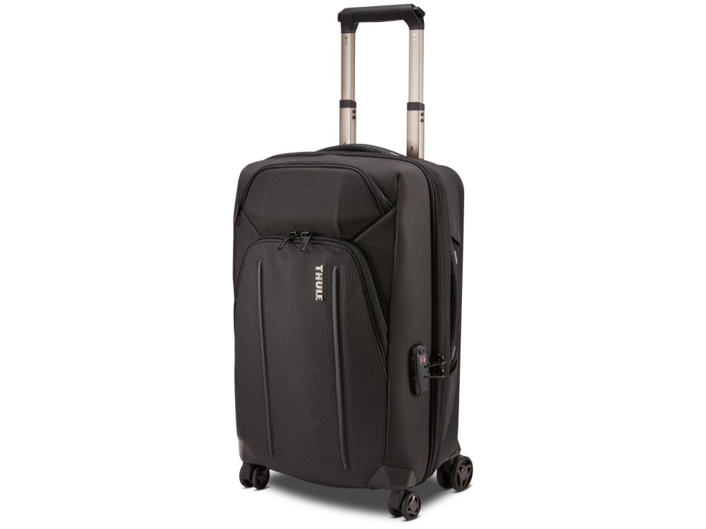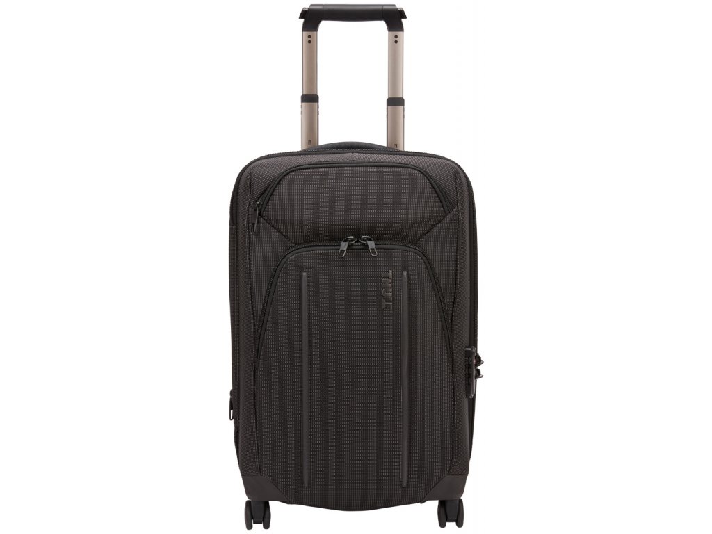 Kabínový cestovný textilný kufor značky Thule Crossover, 55 cm, v čiernej farbe. Odolný a funkčný príručný kufor s natáčacími kolieskami, umožňuje zväčšenie na získanie ďalšieho úložného priestoru, ľahké manévrovanie vďaka ôsmim natáčacím kolieskam.