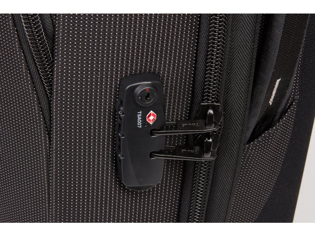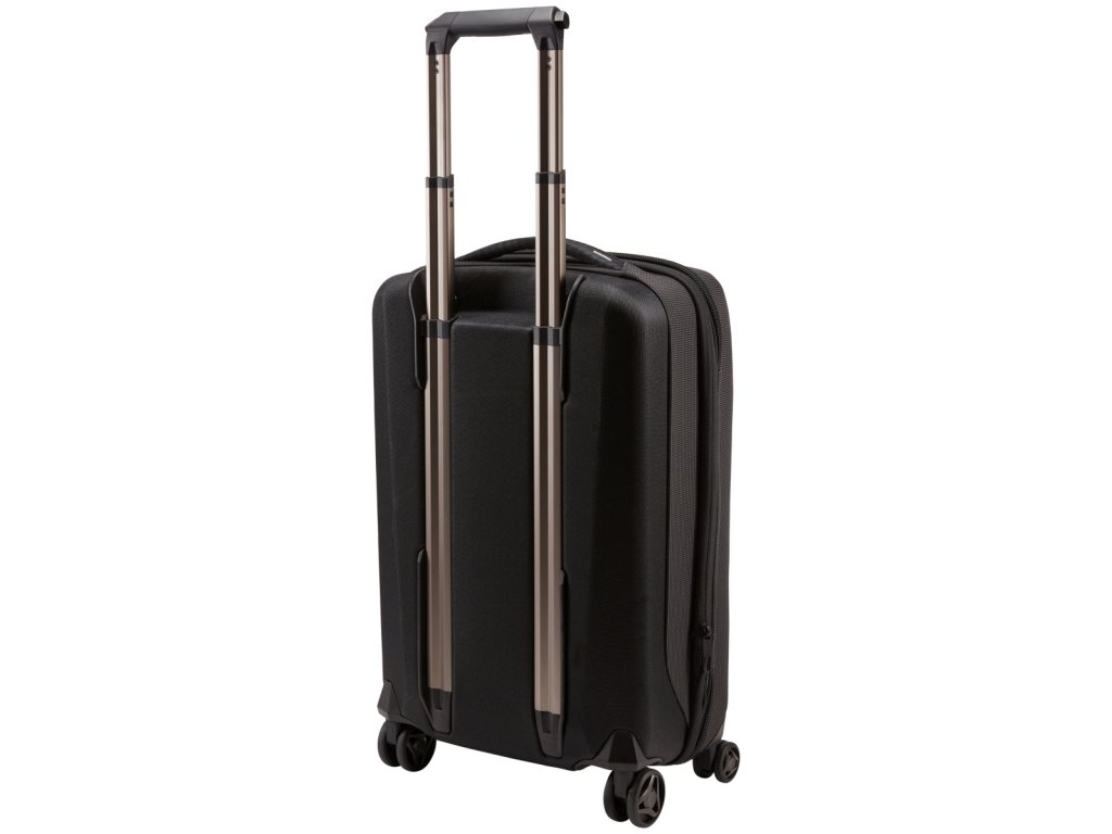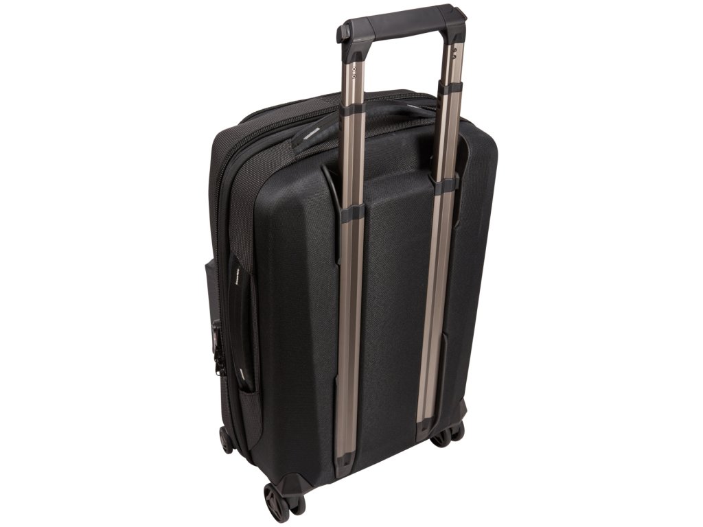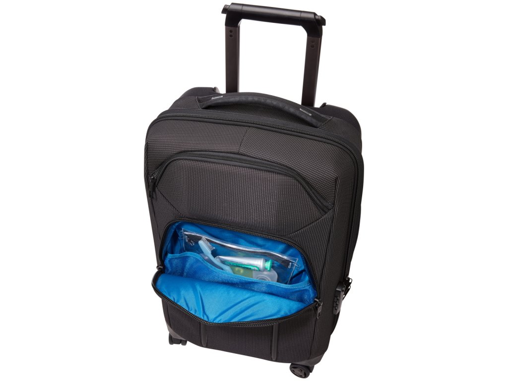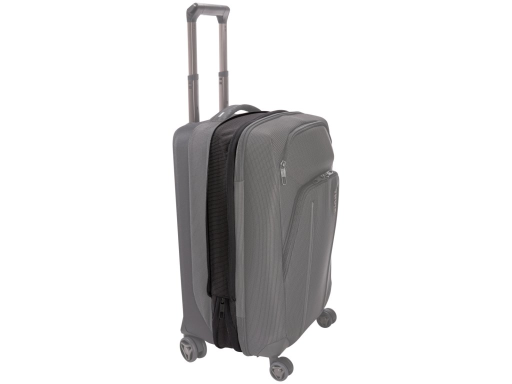 Kabínový cestovný textilný kufor značky Thule Crossover, 55 cm, v čiernej farbe. Odolný a funkčný príručný kufor s natáčacími kolieskami, umožňuje zväčšenie na získanie ďalšieho úložného priestoru, ľahké manévrovanie vďaka ôsmim natáčacím kolieskam.