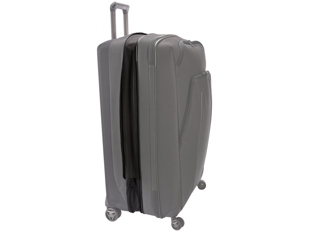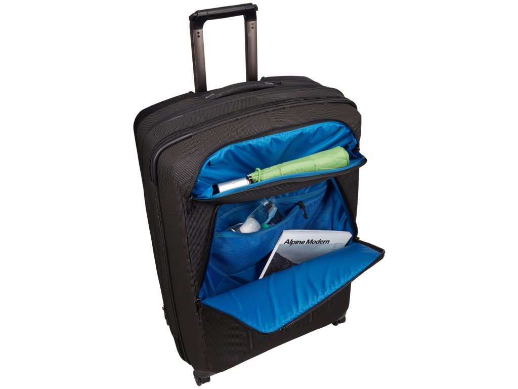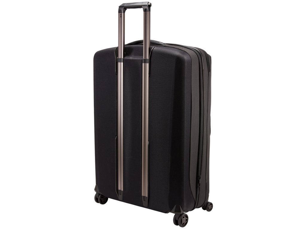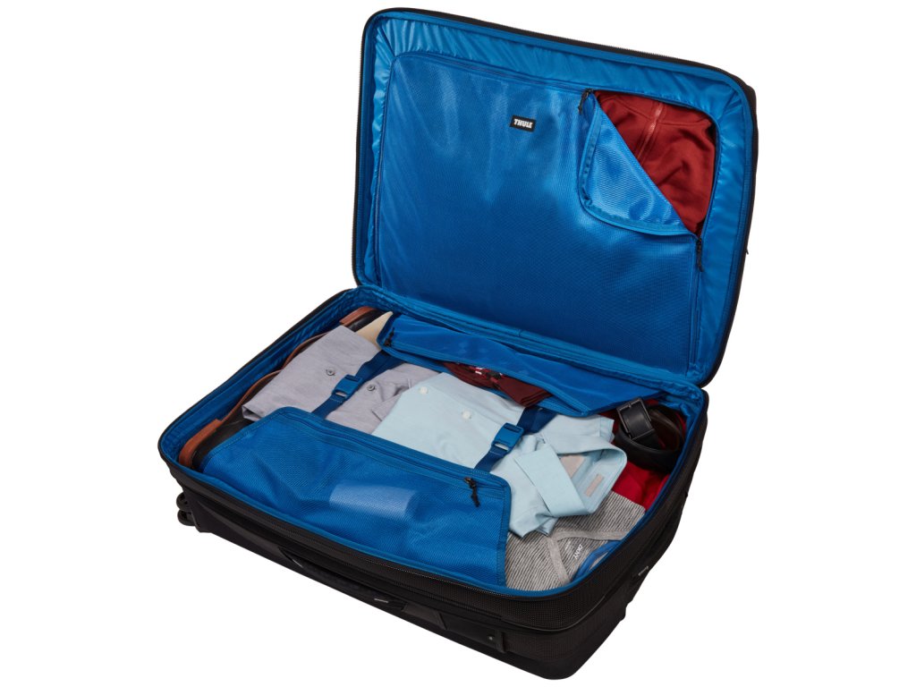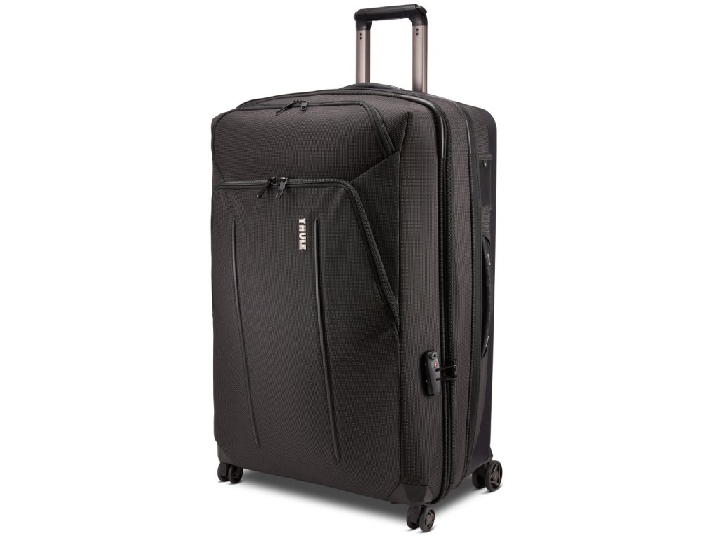 Cestovný kufor značky Thule Crossover, 76 cm, v čiernej farbe. Veľký kufor s natáčacími kolieskami je vhodný pre dlhšie cesty, umožňuje zväčšenie na získanie ďalšieho úložného priestoru a ľahké manévrovanie vďaka ôsmim natáčacím kolieskam.